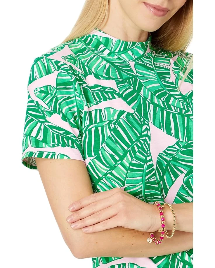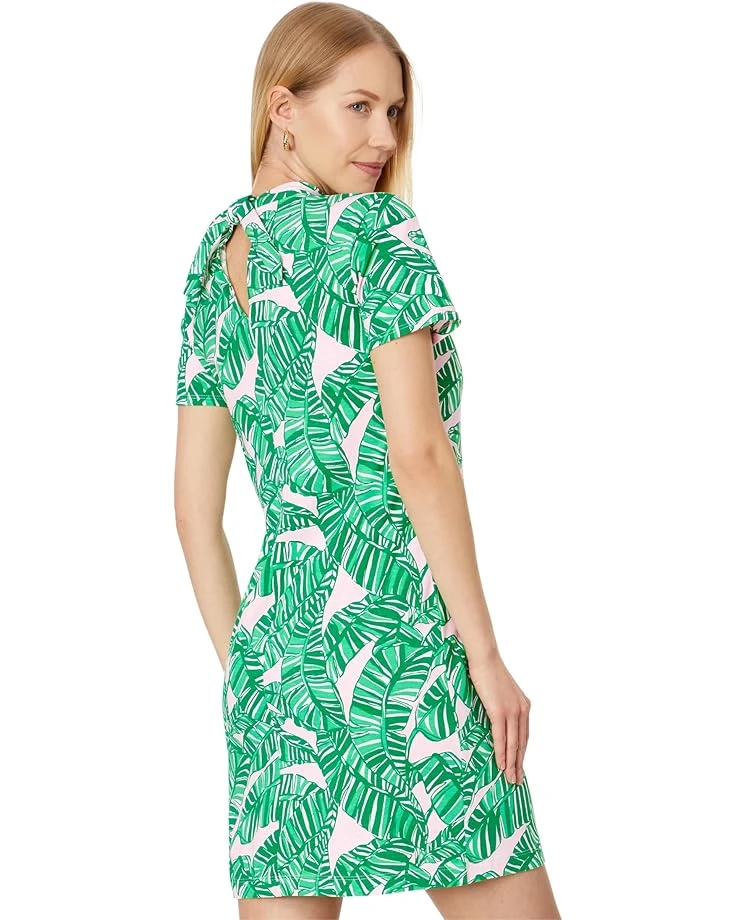 - Bring on a blissful vibe and delight to any occasion wearing Lilly Pulitzer® Hallie Short Sleeve Dress that comes in a fitted construction with an above-the-knee silhouette. The dress features a mock neck, short sleeves, functional back neck tie with slit, and an attractive allover leafy print.