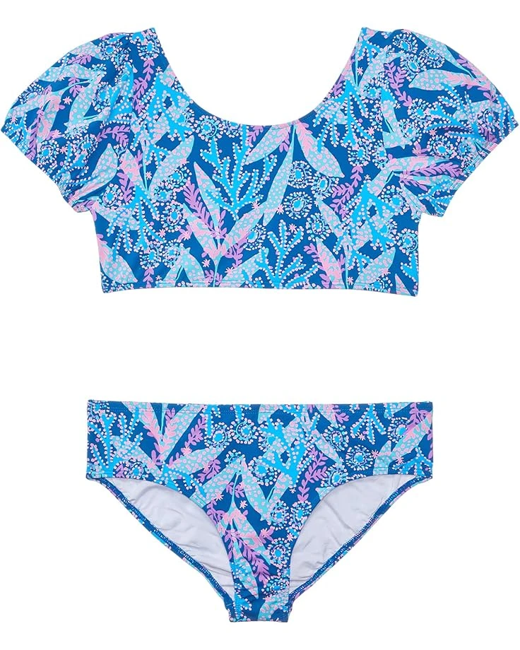 - Sun-kissed style: Lilly Pulitzer® Kids Arlen Bikini radiates charm with a pull-on ease and playful short puff sleeves. Featuring a wide scooped neckline for a comfy fit and matching bottoms for a coordinated look, it blends trendy design with practical comfort for endless beachside fun.