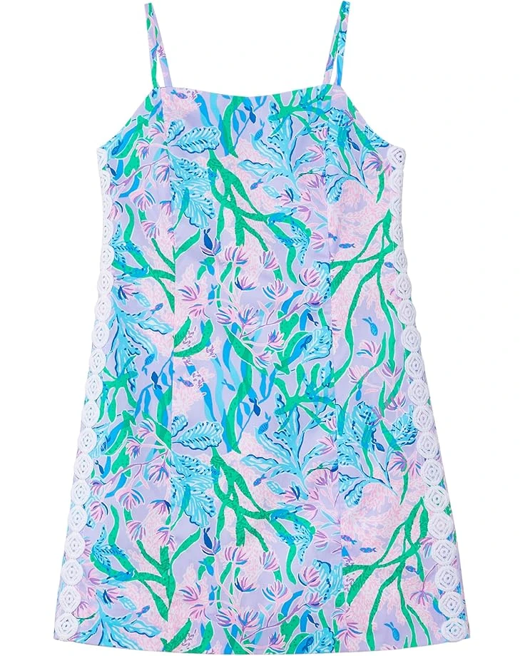 - Your mini fashionista will love twirling around wearing the Lilly Pulitzer® Kids Mini Shelli Dress. With its square neckline, adjustable spaghetti straps, and pretty lace trims, this dress is perfect for any occasion. The smocked back bodice ensures a snug and comfy fit, while the colorful allover print adds a playful touch to her look.