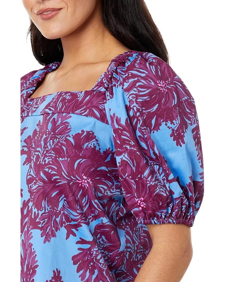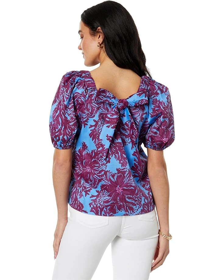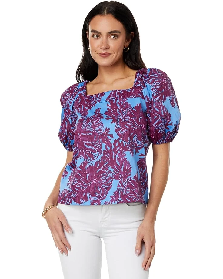 - Give your casual style a slight touch of color and style wearing the Lilly Pulitzer® Torrey Short Sleeve Stretch Top with a classic denim jeans. The top features a squared neckline, short puff sleeves, tie-nack detail, with elasticated cuffs, and a straight hem. The allover printed pattern on the apparel gives it a refined look.