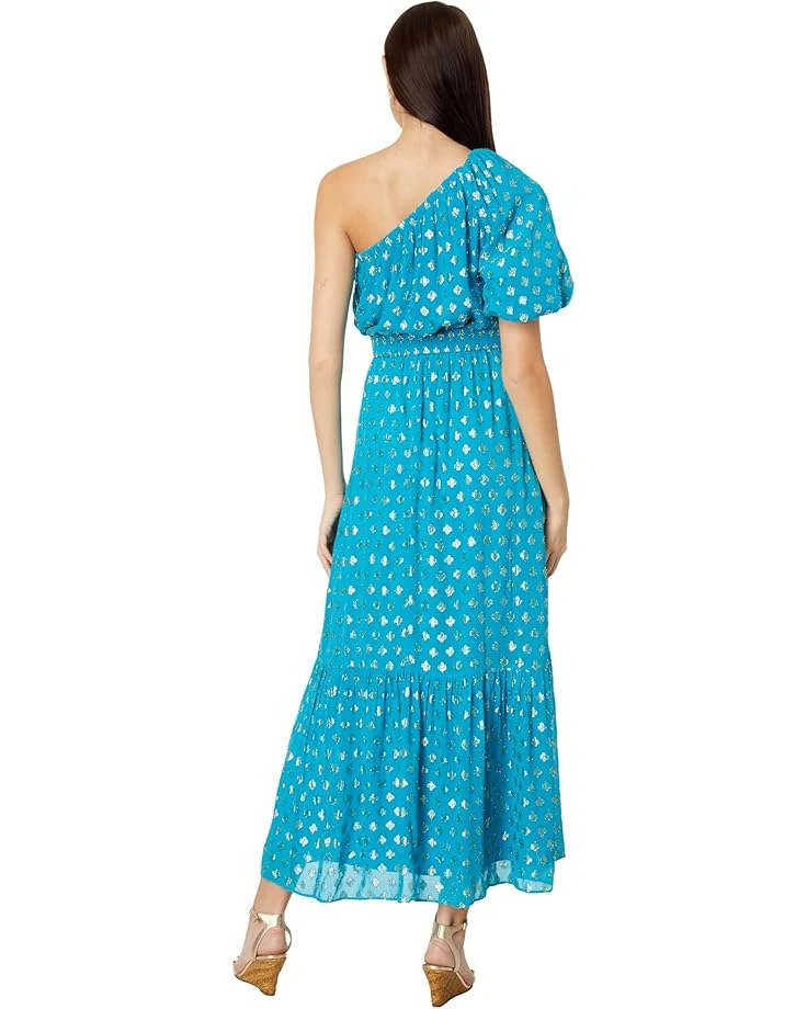 - Add the Lilly Pulitzer® Zelalynn One Shoulder Maxi Dress to your collection. The asymmetrical shoulder is equipped with a short puff sleeve on one side and a sleeveless style on the other. The tiered ruffled skirt adds flow to your design.